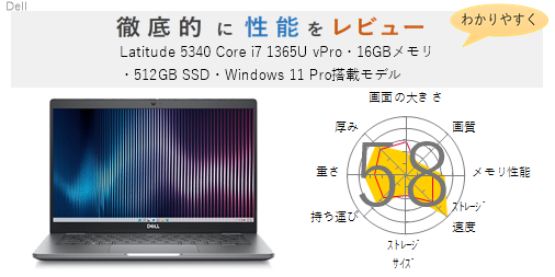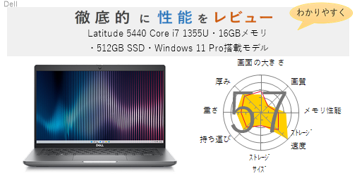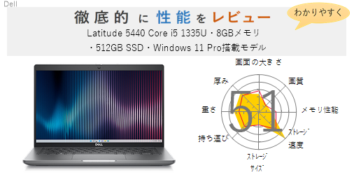 「Latitude 5440 Core i5 1335U・8GBメモリ・512GB SSD・Windows 11 Pro搭載モデル」を機能、スペック・性能、使いやすさの観点から徹底的に評価・レビューしました。またメリットとデメリットも かんたんにまとめています。(全体的にちょっと厳し目に点数をつけているかな?)ぜひ選ぶ際の参考にしてみてください。