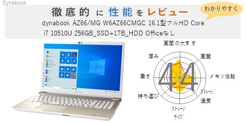 「dynabook AZ66/MG W6AZ66CMGC 16.1型フルHD Core i7 10510U 256GB_SSD+1TB_HDD Officeなし」を機能、スペック・性能、使いやすさの観点から徹底的に評価・レビューしました。またメリットとデメリットも かんたんにまとめています。(全体的にちょっと厳し目に点数をつけているかな?)ぜひ選ぶ際の参考にしてみてください。