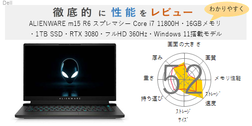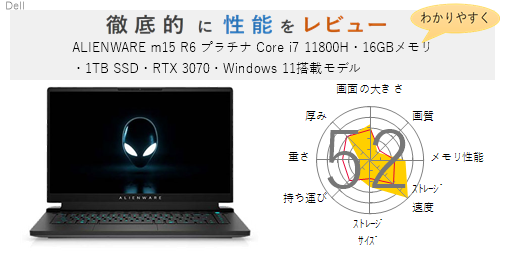 「ALIENWARE m15 R6 プラチナ Core i7 11800H・16GBメモリ・1TB SSD・RTX 3070・Windows 11搭載モデル」の総合評価は52です。