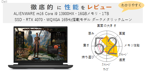 「ALIENWARE m16 Core i9 13900HX・16GBメモリ・1TB SSD・RTX 4070・WQXGA 165Hz搭載モデル ダークメタリックムーン」の総合評価は52です。