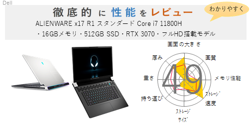 「ALIENWARE x17 R1 スタンダード Core i7 11800H・16GBメモリ・512GB SSD・RTX 3070・フルHD搭載モデル」を機能、スペック・性能、使いやすさの観点から徹底的に評価・レビューしました。またメリットとデメリットも かんたんにまとめています。(全体的にちょっと厳し目に点数をつけているかな?)ぜひ選ぶ際の参考にしてみてください。
