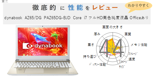 「dynabook AZ65/DG PAZ65DG-BJD Core i7 フルHD高色純度液晶 Officeあり」を機能、スペック・性能、使いやすさの観点から徹底的に評価・レビューしました。またメリットとデメリットも かんたんにまとめています。(全体的にちょっと厳し目に点数をつけているかな?)ぜひ選ぶ際の参考にしてみてください。