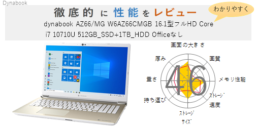「dynabook AZ66/MG W6AZ66BMGC 16.1型フルHD Core i7 10510U 256GB_SSD+1TB_HDD Officeあり」を機能、スペック・性能、使いやすさの観点から徹底的に評価・レビューしました。またメリットとデメリットも かんたんにまとめています。(全体的にちょっと厳し目に点数をつけているかな?)ぜひ選ぶ際の参考にしてみてください。