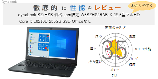 「dynabook BZ/HSB 価格.com限定 W6BZHS5PAB-K 15.6型フルHD Core i5 10210U 256GB SSD Officeあり」の総合評価は35です。