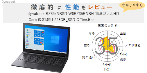 「dynabook BZ35/NBSD W6BZ35BNBD 15.6型フルHD Core i5 8265U 256GB_SSD Officeあり」を機能、スペック・性能、使いやすさの観点から徹底的に評価・レビューしました。またメリットとデメリットも かんたんにまとめています。(全体的にちょっと厳し目に点数をつけているかな?)ぜひ選ぶ際の参考にしてみてください。