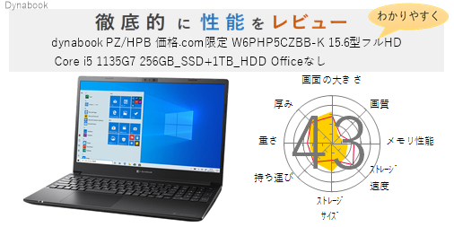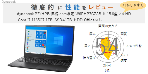 「dynabook PZ/HPB 価格.com限定 W6PHP7BZDB-K 15.6型フルHD Core i7 1165G7 256GB_SSD+1TB_HDD Officeあり」を機能、スペック・性能、使いやすさの観点から徹底的に評価・レビューしました。またメリットとデメリットも かんたんにまとめています。(全体的にちょっと厳し目に点数をつけているかな?)ぜひ選ぶ際の参考にしてみてください。
