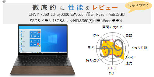 「ENVY x360 13-ay0000 価格.com限定 Ryzen 7&512GB SSD&メモリ16GB&フルHD&360度回転 Woodモデル」の総合評価は59です。