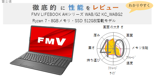 「FMV LIFEBOOK AHシリーズ WAB/G2 KC_WABG2 Ryzen 7・8GBメモリ・SSD 512GB搭載モデル」を機能、スペック・性能、使いやすさの観点から徹底的に評価・レビューしました。またメリットとデメリットも かんたんにまとめています。(全体的にちょっと厳し目に点数をつけているかな?)ぜひ選ぶ際の参考にしてみてください。