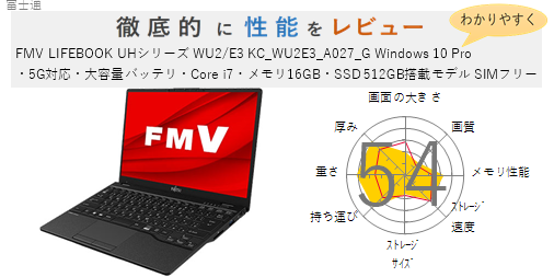「FMV LIFEBOOK UHシリーズ WU2/E3 KC_WU2E3_A028_G Windows 10 Pro・5G対応・大容量バッテリ・Core i7・メモリ16GB・SSD 512GB・Office搭載モデル SIMフリー」を機能、スペック・性能、使いやすさの観点から徹底的に評価・レビューしました。またメリットとデメリットも かんたんにまとめています。(全体的にちょっと厳し目に点数をつけているかな?)ぜひ選ぶ際の参考にしてみてください。