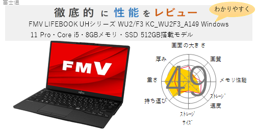 「FMV LIFEBOOK UHシリーズ WU2/F3 KC_WU2F3_A148 Windows 11 Pro・大容量バッテリ・Core i5・8GBメモリ・SSD 256GB・Office搭載モデル」を機能、スペック・性能、使いやすさの観点から徹底的に評価・レビューしました。またメリットとデメリットも かんたんにまとめています。(全体的にちょっと厳し目に点数をつけているかな?)ぜひ選ぶ際の参考にしてみてください。