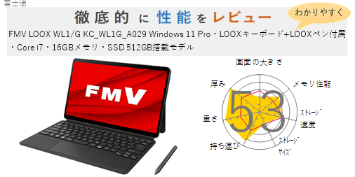 「FMV LOOX WL1/G KC_WL1G_A026 Windows 11 Pro・LOOXキーボード+LOOXペン付属・Core i7・16GBメモリ・SSD 256GB・Office搭載モデル」を機能、スペック・性能、使いやすさの観点から徹底的に評価・レビューしました。またメリットとデメリットも かんたんにまとめています。(全体的にちょっと厳し目に点数をつけているかな?)ぜひ選ぶ際の参考にしてみてください。