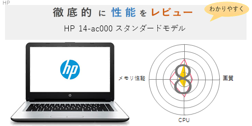 オレンジが「HP 14-ac000 エントリーモデル」の項目別点数となります。参考として本サイトで紹介しているノートパソコン平均値を赤線で表しています。赤線よりもオレンジの点数が高い場合は「HP 14-ac000 エントリーモデル」の強みだと思ってください。