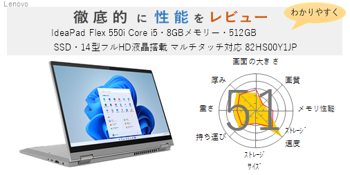 「IdeaPad Flex 550i Core i5・8GBメモリー・512GB SSD・14型フルHD液晶搭載 マルチタッチ対応 オフィス付き 82HS00XVJP」を機能、スペック・性能、使いやすさの観点から徹底的に評価・レビューしました。またメリットとデメリットも かんたんにまとめています。(全体的にちょっと厳し目に点数をつけているかな?)ぜひ選ぶ際の参考にしてみてください。