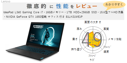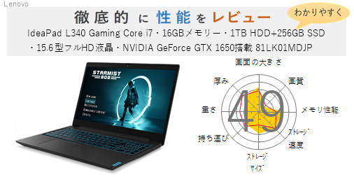 「IdeaPad L340 Gaming Core i7・16GBメモリー・1TB HDD+256GB SSD・15.6型フルHD液晶・NVIDIA GeForce GTX 1650搭載 オフィス付き 81LK01MEJP」を機能、スペック・性能、使いやすさの観点から徹底的に評価・レビューしました。またメリットとデメリットも かんたんにまとめています。(全体的にちょっと厳し目に点数をつけているかな?)ぜひ選ぶ際の参考にしてみてください。