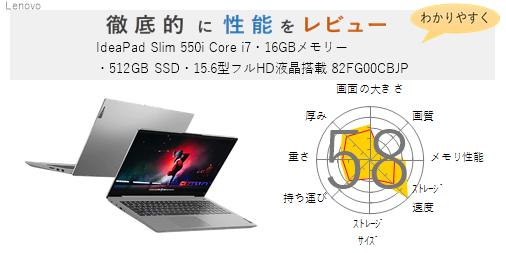 「IdeaPad Slim 550i Core i7・16GBメモリー・512GB SSD・14型フルHD液晶搭載 オフィス付き 82FE00E1JP」の総合評価は58です。