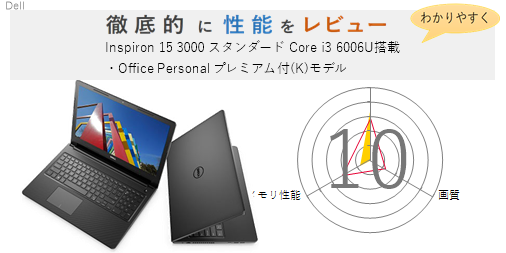 「Inspiron 15 3000 価格.com限定 スタンダード Core i3 6006U搭載・Office Personal プレミアム付モデル」を機能、スペック・性能、使いやすさの観点から徹底的に評価・レビューしました。またメリットとデメリットも かんたんにまとめています。(全体的にちょっと厳し目に点数をつけているかな?)ぜひ選ぶ際の参考にしてみてください。