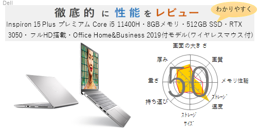 「Inspiron 15 Plus プラチナ Core i7 11800H・16GBメモリ・512GB SSD・RTX 3050Ti・フルHD搭載モデル」を機能、スペック・性能、使いやすさの観点から徹底的に評価・レビューしました。またメリットとデメリットも かんたんにまとめています。(全体的にちょっと厳し目に点数をつけているかな?)ぜひ選ぶ際の参考にしてみてください。