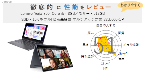 「Lenovo Yoga 750i Core i5・8GBメモリー・512GB SSD・15.6型フルHD液晶搭載 マルチタッチ対応 オフィス付き 82BJ005RJP」を機能、スペック・性能、使いやすさの観点から徹底的に評価・レビューしました。またメリットとデメリットも かんたんにまとめています。(全体的にちょっと厳し目に点数をつけているかな?)ぜひ選ぶ際の参考にしてみてください。