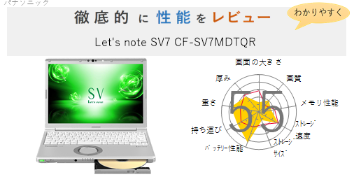 Let's note SV7 CF-SV7LFGQR SIMフリーの 画面の大きさ 画質 グラフィック描画 CPU性能 ストレージ 容量 メモリ性能 持ち運び 重さ 厚み 設置性 操作性 レーダーチャート