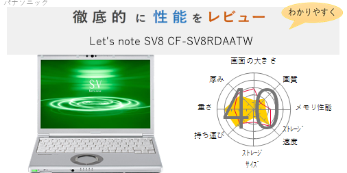 「Let’s note SV8 CF-SV8JDCVS」を機能、スペック・性能、使いやすさの観点から徹底的に評価・レビューしました。またメリットとデメリットも かんたんにまとめています。(全体的にちょっと厳し目に点数をつけているかな?)ぜひ選ぶ際の参考にしてみてください。
