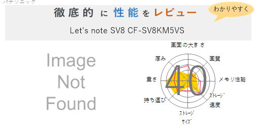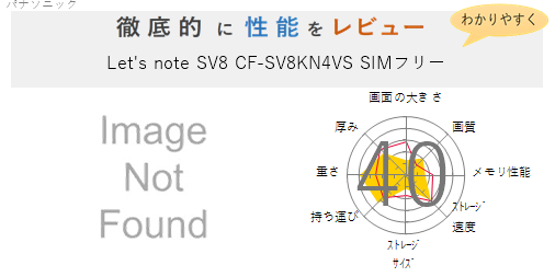 オレンジが「Let’s note SV8 CF-SV8KM9VS」の項目別点数となります。参考として本サイトで紹介しているノートパソコン平均値を赤線で表しています。赤線よりもオレンジの点数が高い場合は「Let’s note SV8 CF-SV8KM9VS」の強みだと思ってください。