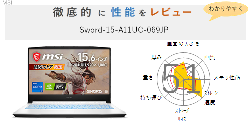 オレンジが「LEVEL-15FXR23-i7-RASX-IeC Core i7 10870H/16GBメモリ/500GB SSD/RTX 3060/15インチ フルHD」の項目別点数となります。参考として本サイトで紹介しているノートパソコン平均値を赤線で表しています。赤線よりもオレンジの点数が高い場合は「LEVEL-15FXR23-i7-RASX-IeC Core i7 10870H/16GBメモリ/500GB SSD/RTX 3060/15インチ フルHD」の強みだと思ってください。