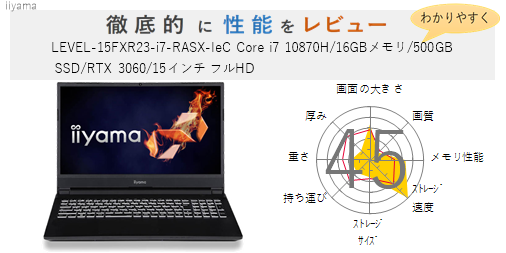 「LEVEL-15FXR23-i7-RASX-IeC Core i7 10870H/16GBメモリ/500GB SSD/RTX 3060/15インチ フルHD」の総合評価は45です。