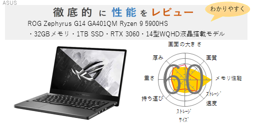 「ROG Zephyrus G14 GA401QM Ryzen 9 5900HS・32GBメモリ・1TB SSD・RTX 3060・14型WQHD液晶搭載モデル」を機能、スペック・性能、使いやすさの観点から徹底的に評価・レビューしました。またメリットとデメリットも かんたんにまとめています。(全体的にちょっと厳し目に点数をつけているかな?)ぜひ選ぶ際の参考にしてみてください。