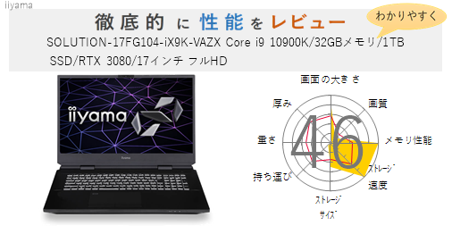 「SENSE-17FG104-iX9K-VAZX Core i9 10900K/32GBメモリ/1TB SSD/RTX 3080/17インチ フルHD」の総合評価は46です。