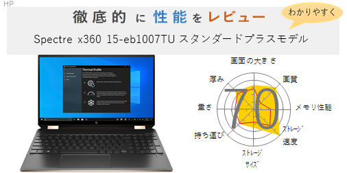 「Spectre x360 15-eb1005TU スタンダードモデル」を機能、スペック・性能、使いやすさの観点から徹底的に評価・レビューしました。またメリットとデメリットも かんたんにまとめています。(全体的にちょっと厳し目に点数をつけているかな?)ぜひ選ぶ際の参考にしてみてください。