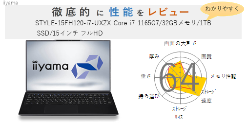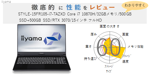 「STYLE-15FR105-i7-TAZX Core i7 10870H/32GBメモリ/1TB SSD/RTX 3070/15インチ フルHD」の総合評価は61です。