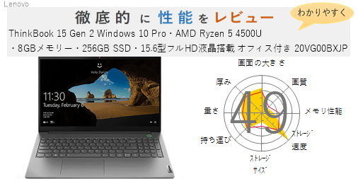 「ThinkBook 15 Gen 2 Windows 10 Pro・AMD Ryzen 5 4500U・8GBメモリー・256GB SSD・15.6型フルHD液晶搭載 オフィス付き 20VG00BXJP」を機能、スペック・性能、使いやすさの観点から徹底的に評価・レビューしました。またメリットとデメリットも かんたんにまとめています。(全体的にちょっと厳し目に点数をつけているかな?)ぜひ選ぶ際の参考にしてみてください。