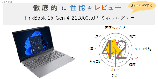 「ThinkBook 15 Gen 4 21DJ00J4JP ミネラルグレー」を機能、スペック・性能、使いやすさの観点から徹底的に評価・レビューしました。またメリットとデメリットも かんたんにまとめています。(全体的にちょっと厳し目に点数をつけているかな?)ぜひ選ぶ際の参考にしてみてください。
