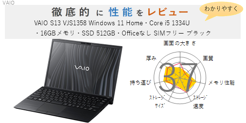 「VAIO S13 VJS1358 Windows 11 Home・Core i5 1334U・16GBメモリ・SSD 512GB・Officeなし SIMフリー ブラック」を機能、スペック・性能、使いやすさの観点から徹底的に評価・レビューしました。またメリットとデメリットも かんたんにまとめています。(全体的にちょっと厳し目に点数をつけているかな?)ぜひ選ぶ際の参考にしてみてください。