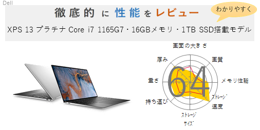 「XPS 13 プラチナ Core i7 1165G7・16GBメモリ・1TB SSD搭載・Office Home&Business 2019付モデル」の総合評価は64です。
