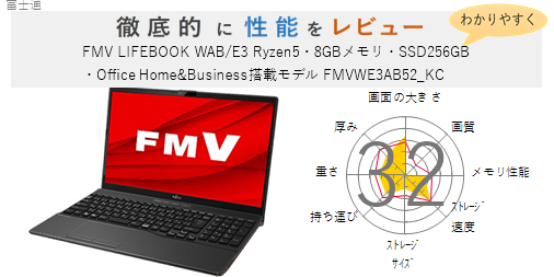 「FMV LIFEBOOK WAB/E3 Ryzen5・8GBメモリ・SSD256GB・Office Home&Business搭載モデル FMVWE3AB52_KC」を機能、スペック・性能、使いやすさの観点から徹底的に評価・レビューしました。またメリットとデメリットも かんたんにまとめています。(全体的にちょっと厳し目に点数をつけているかな?)ぜひ選ぶ際の参考にしてみてください。